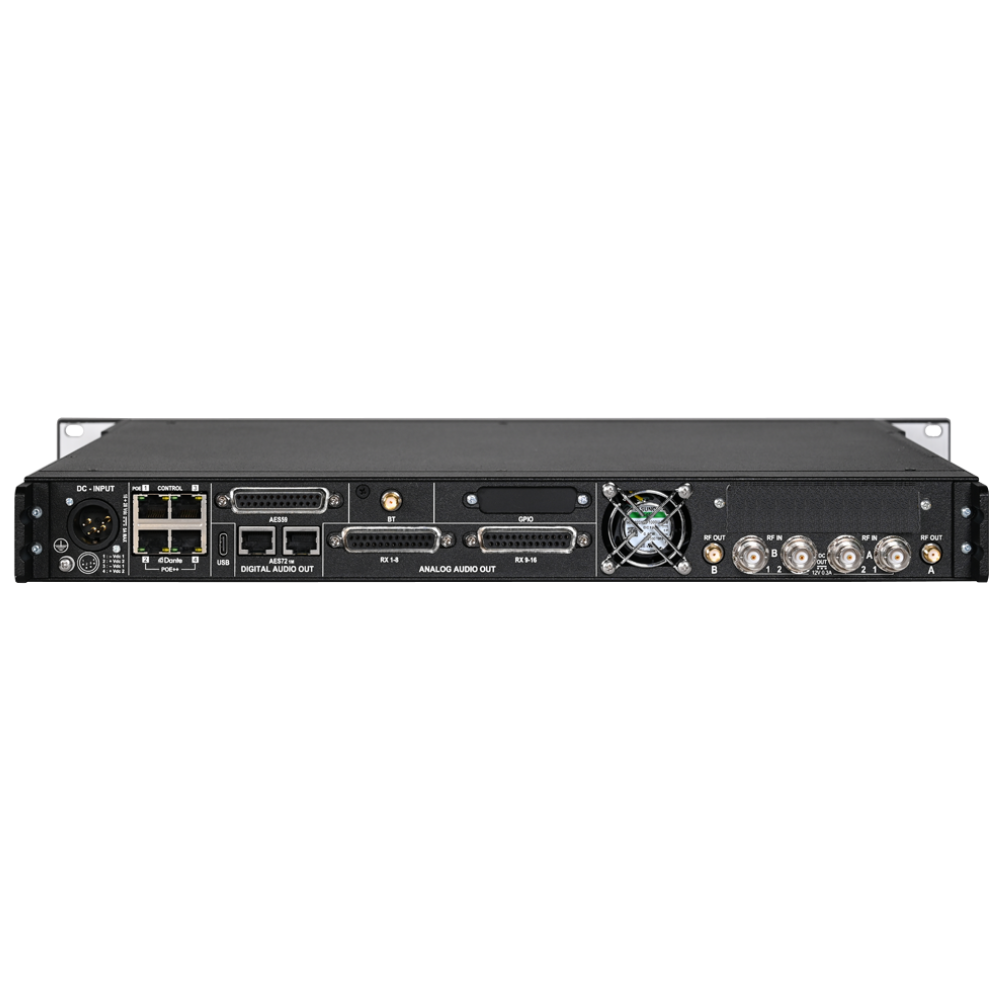Cada chasis MRK16 cuenta con un switch interno y conexión con protocolo DANTE en cascada, permitiendo una integración sin fisuras con otros dispositivos de la red. Las salidas analógicas y digitales son compatibles con una amplia gama de protocolos como AES3 y AES67, lo que facilita la interconexión con sistemas de audio existentes y futuros. Además, el slot opcional para la tarjeta de expansión permite la recepción de señal de antena mediante fibra óptica, lo que asegura una transmisión de señal estable y de alta calidad incluso en entornos complejos.