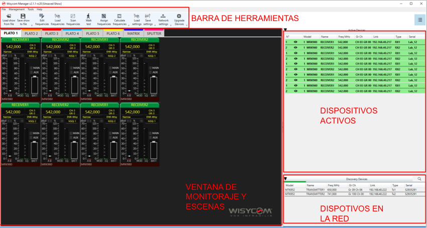 El software Wisycom Manager, permite la monitorización, el control y administración de la mayoría de dispositivos de Wisycom mediante conexión ethernet 10/100. También podemos controlar las funciones de las antenas activas, amplificadores, receptores, transmisores, matrices, “splitters”, e incluso los modelos para la distribución de RF mediante fibra óptica. Entre otras muchas funciones, nos permite hacer búsqueda de frecuencias selectivas (“scanner”) y seleccionar las más óptimas para cada uno de los estudios. De esta forma podremos guardar esta información en nuestro ordenador para poder rescatarla cuando nos sea necesario. La función de scanner la podemos ver gráficamente en la pantalla de nuestro ordenador, esta función solo esta disponible para el modelo de Wisycom MRK980. El Wisycom Manager también nos permite acceder a las funciones de las matrices y splitters para poder hacer los cambios que necesitemos. Incorpora varios niveles de acceso para evitar manipulaciones de personas no autorizadas. Con la versión actual del Wisycom Manager también podemos gestionar desde cada “control room” todos los dispositivos. En resumen, tendremos un control total de los dispositivos instalados.