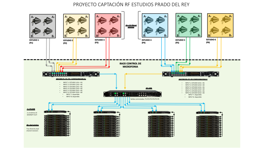 En resumen, la señal de RF de cada estudio se conmutará en cada splitter a través de las matrices MAT288. Con la opción descrita conseguimos que los receptores inalámbricos reciban la suma de las señales de todos los estudios, esto nos permite utilizar cada micrófono de mano o petaca transmisora en cada estudio.