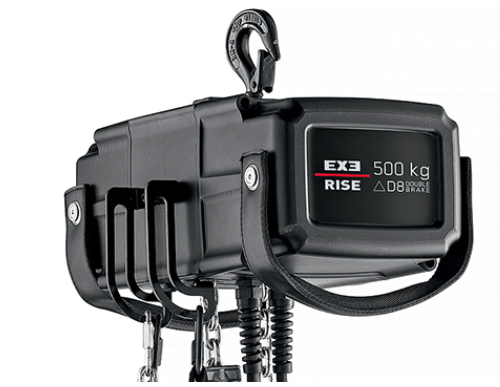 El modelo D8+ 500kg: dispone de doble freno, una potencia de 0,8kw, un tamaño de cadena de 6 x 18mm y un peso de 36kg.