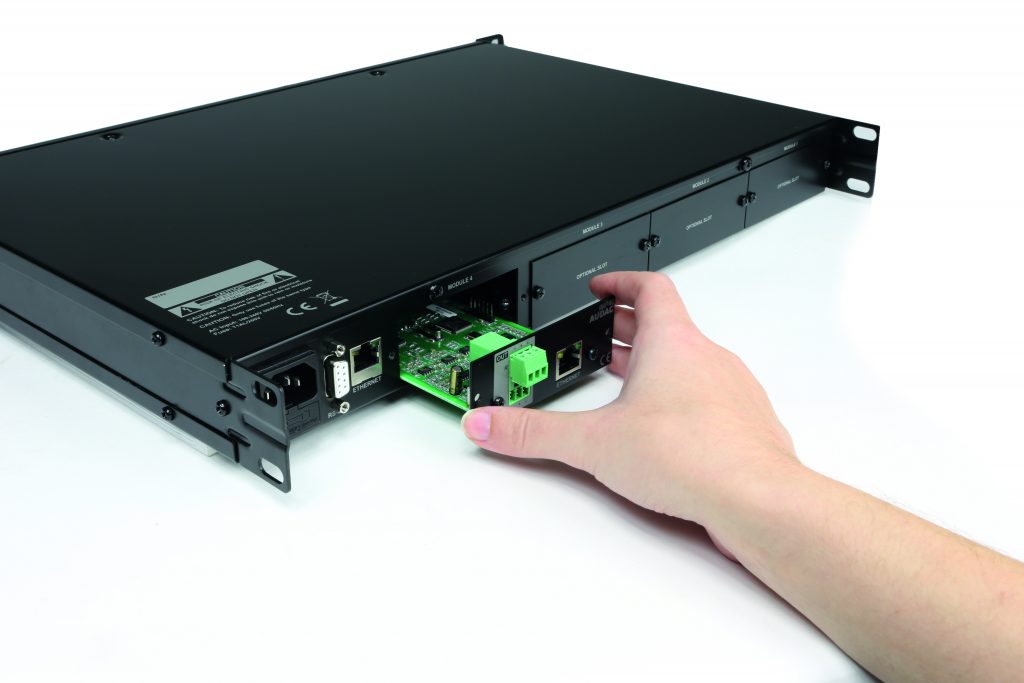 El XMP44 se puede expandir con una tarjeta opcional Dante™, la ANX44, que permite enviar y recibir a baja latencia, audio de alta calidad sobre una red Ethernet.