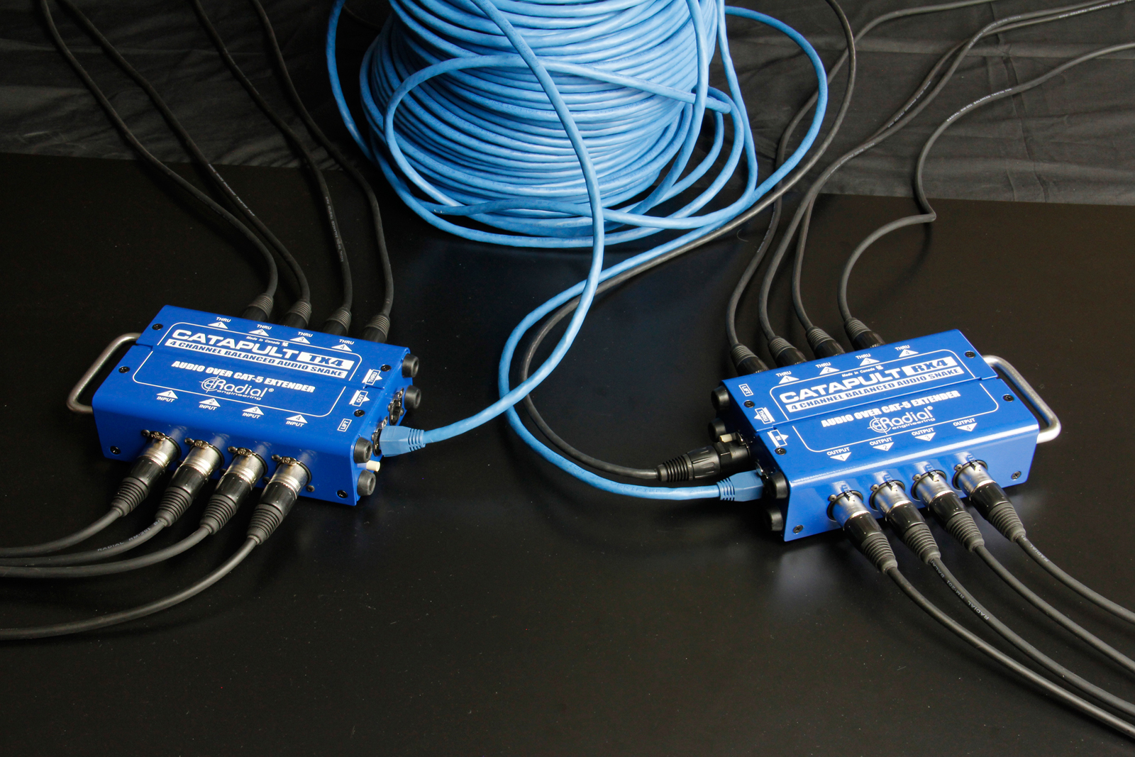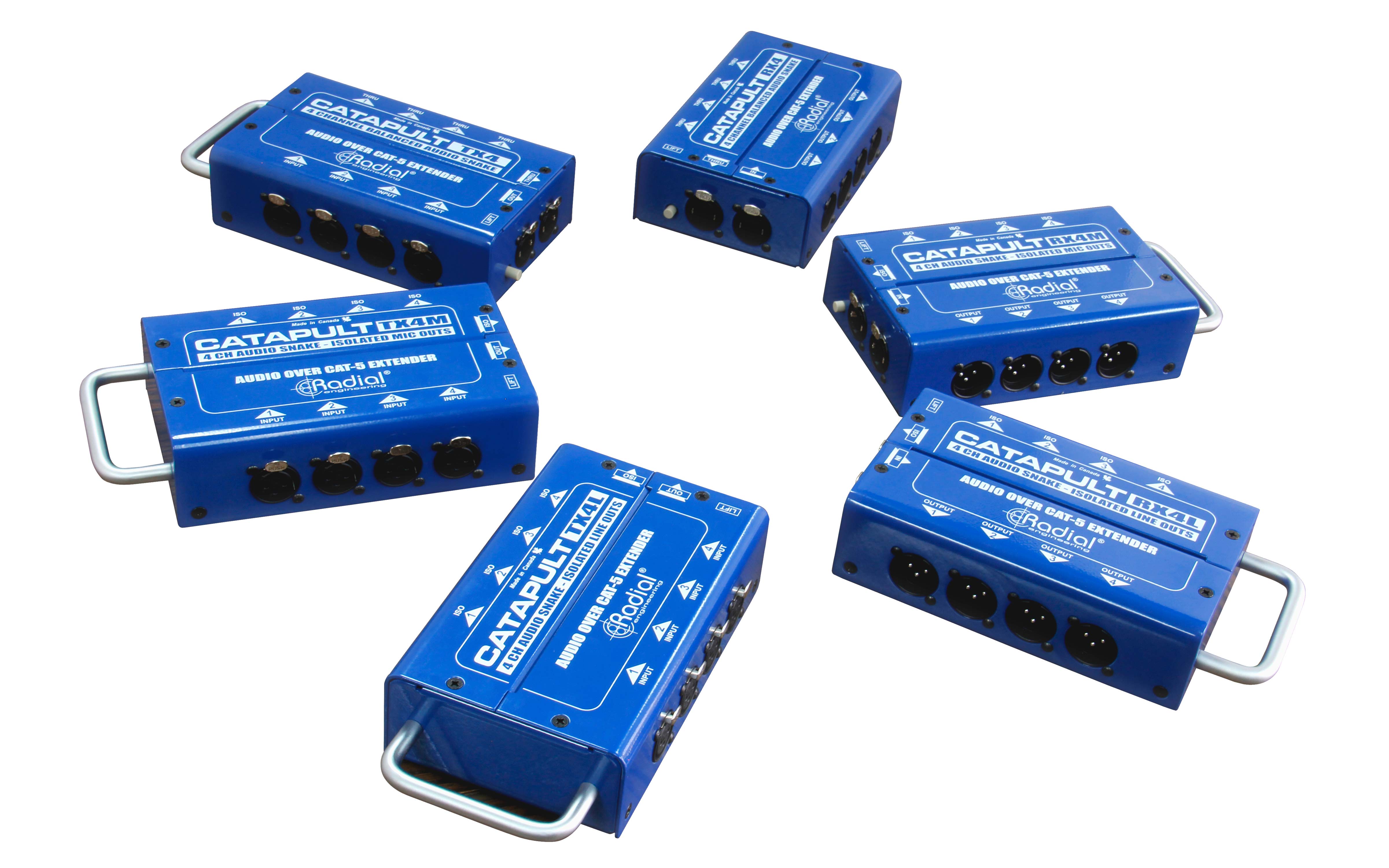 Este pequeño dispositivo permite enviar 4 señales de audio analógico o digital AES a través de un cable estándar CAT5, de una manera sencilla, económica y garantizando la calidad de audio que Radial proporciona. Disponible en 6 configuraciones, Catapult permite elegir 3 módulos de inputs y 3 módulos de outputs distintos, para enviar y recuperar la señal de audio con el nivel de señal que necesites, ya sea en nivel de micro o linea, con transformador o sin él.