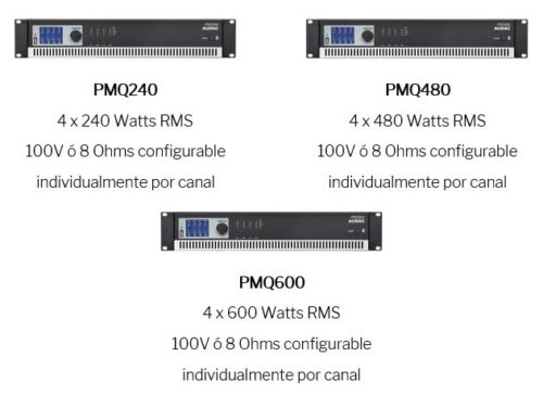 AUDAC saca al mercado la nueva serie PMQ. Estas etapas de 4 canales de línea de 100V incorporan el DSP con el ya conocido WaveDynamicsTM. Además de las características que nos ofrece este DSP, incorpora la selección a 100V ó 8 Ohms de forma independiente por canal.