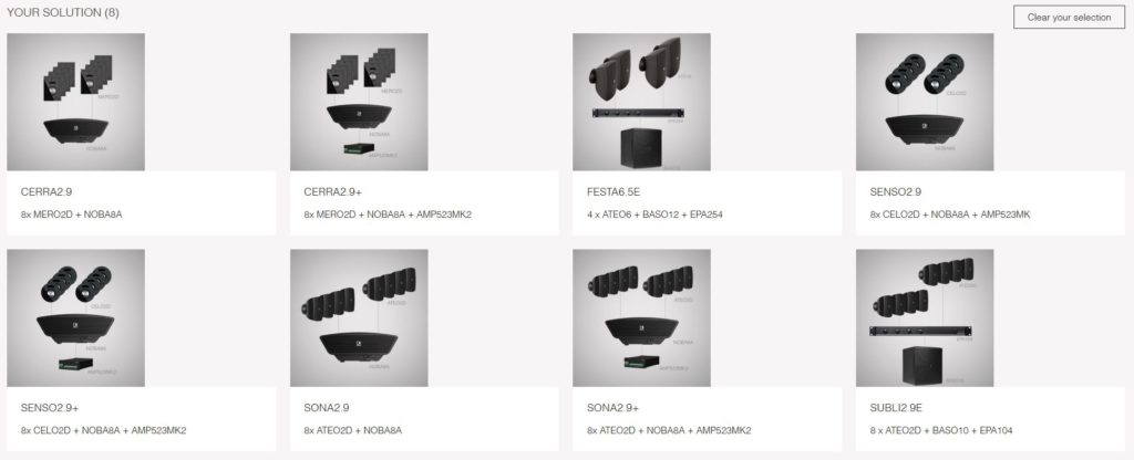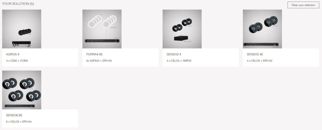Por ejemplo, una instalación de con altavoz de empotrar, para cubrir entre 60 y 120m2 y con un nivel para música de fondo, el configurador nos ofrece 5 soluciones diferentes a escoger.