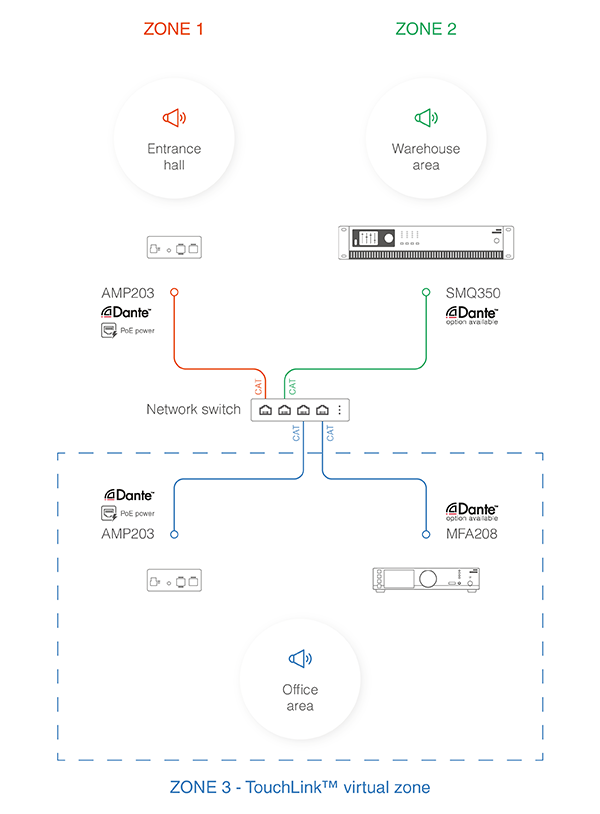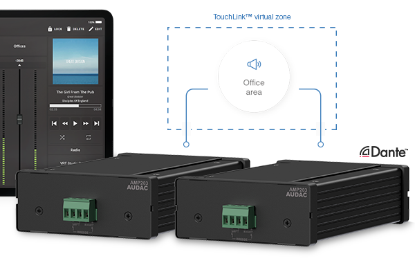 Gracias al uso multifuncional del AMP203 en combinación con la aplicación AUDAC Touch ™ 2, es posible crear un sistema descentralizado de zonas múltiples. Simplemente conectando el AMP203 a la red local y conectando los altavoces, se puede introducir una nueva zona en su sistema.