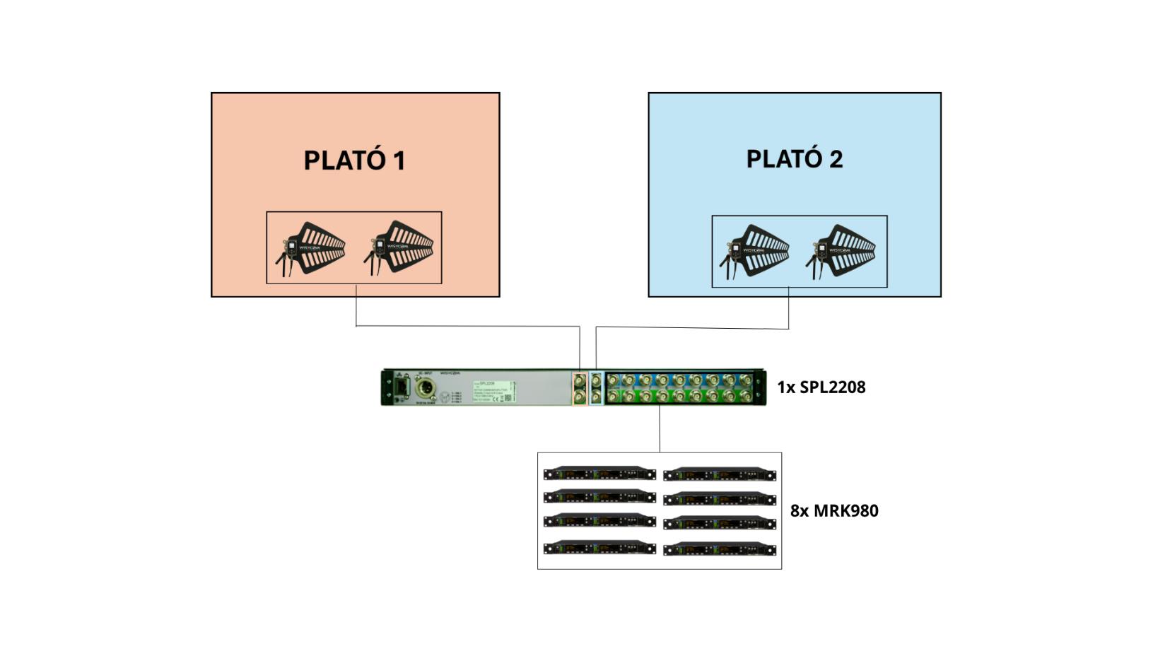 En otros casos, adentrados más en el mundo Broadcast, es una gran solución para poder monitorizar 2 platós diferentes desde una zona remota, sin tener que sobredimensionar las necesidades con una matriz dedicada. En casos como el que se presenta a continuación, dónde la distancia entre platós es pequeña, se puede hacer mediante BNC. En caso de tener grandes distancias entre platós, se podría optar por usar el SPL2208 junto con los módulos conversores de RF a Fibra: BFLT/R.