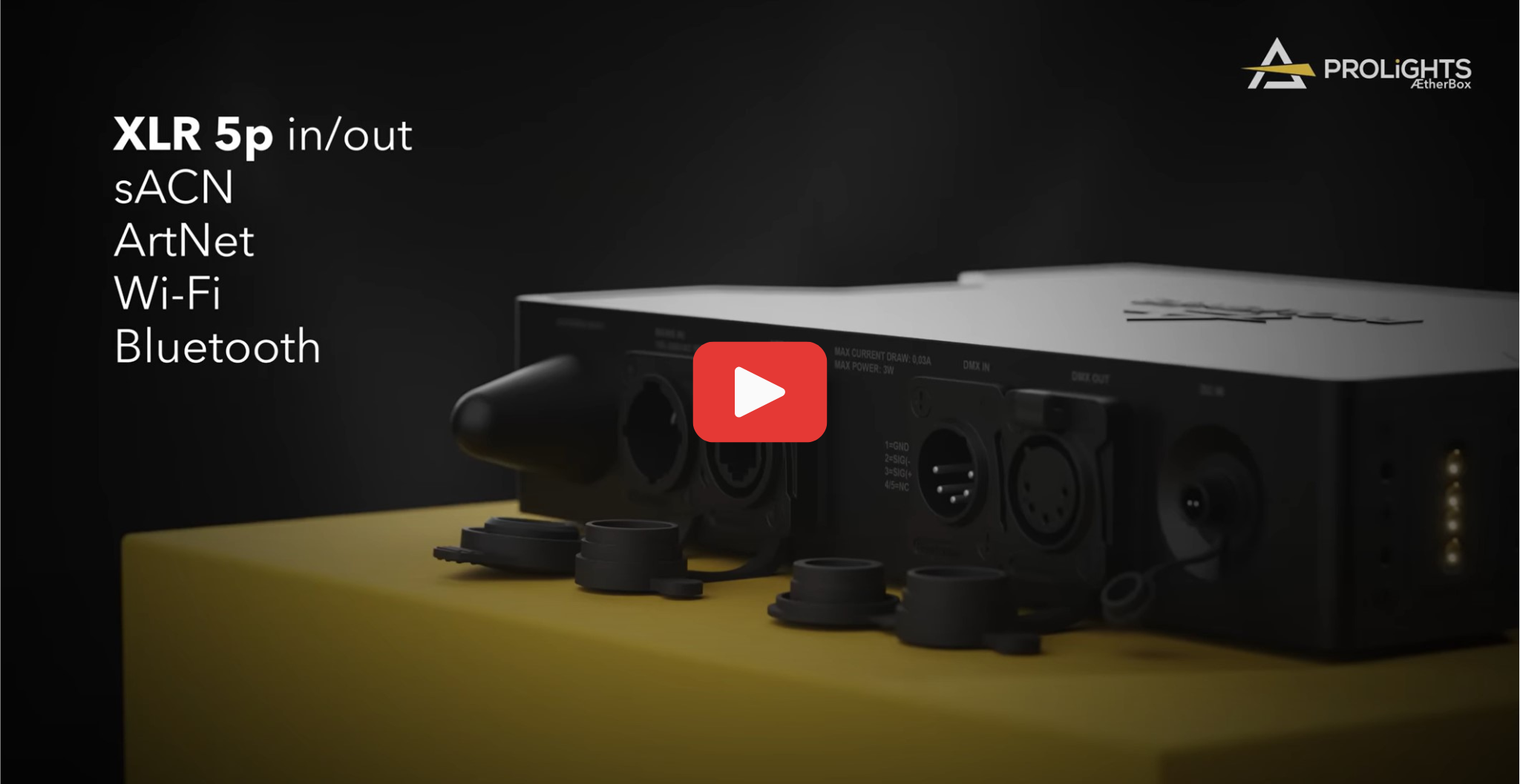Presentamos el AetherBox, un robusto transceptor CRMX de un solo universo con clasificación IP65 diseñado para uso profesional en cualquier entorno interior o exterior. Con entrada/salida XLR 5p, Ethernet (sACN y ArtNet), Wi-Fi y Bluetooth, el AetherBox es compatible con los protocolos CRMX y CRMX2 y ofrece una versatilidad y fiabilidad inigualables.