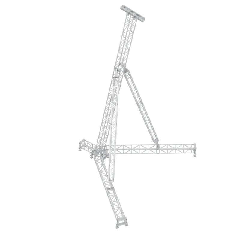 Además el usar truss estándar en su construcción, en lugar de truss personalizado, hace que el reemplazo de las secciones de truss sea más rápido y sencillo. La torre vertical principal está construida con cercha QL40A, mientras que la armadura QH30SA se utiliza para las patas estabilizadoras. Los robustos conectores de la horquilla aseguran que todos los puntos de conexión del truss sean fuertes y rígidos. Se puede usar un polipasto eléctrico de cadena o un cabrestante manual para levantar el sistema de altavoces de matriz lineal.