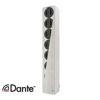 Altavoz activo tipo columna. Control electrónico de directividad; 8x 4 LF y 24x 1 HF, AES\EBU y DANTE; 957 x 186 x 159 mm; Color blanco.