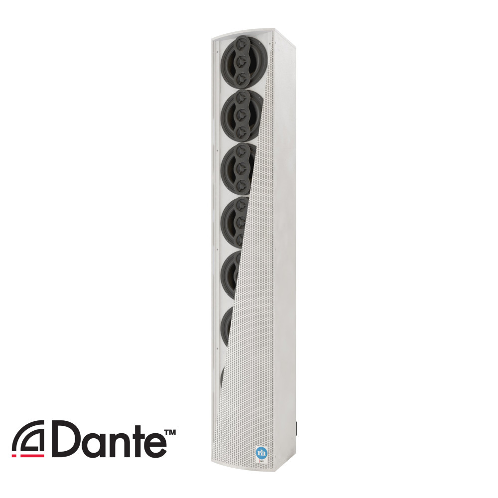 Altavoz tipo columna con DSP interno con control electrónico de directividad mediante algoritmos OmniBeam; 8 woofers de 4 (cada uno monta 3 tweeters de 1), 8 canales de amplificación de 50W RMS y DSP; dispersión horizontal 120°; dispersión vertical regulable de 20° a 30° para cada lóbulo (máx. 4 lóbulos); Haz vertical ajustable electrónicamente +/-30°; Control de directividad a partir de 800 Hz; Respuesta en frecuencia: 135-17 kHz; SPL máx. 96 dB (a 30 metros), entrada doble balanceada analógica y digital AES\EBU y DANTE; 2x RJ- 45 para conexión Ethernet; contactos para monitorear el estado del altavoz; Dimensiones (AlxAnxPr): 957 x 186 x 159 mm; soporte de pared giratorio incluido; Peso: 16,3 kg; Color blanco.