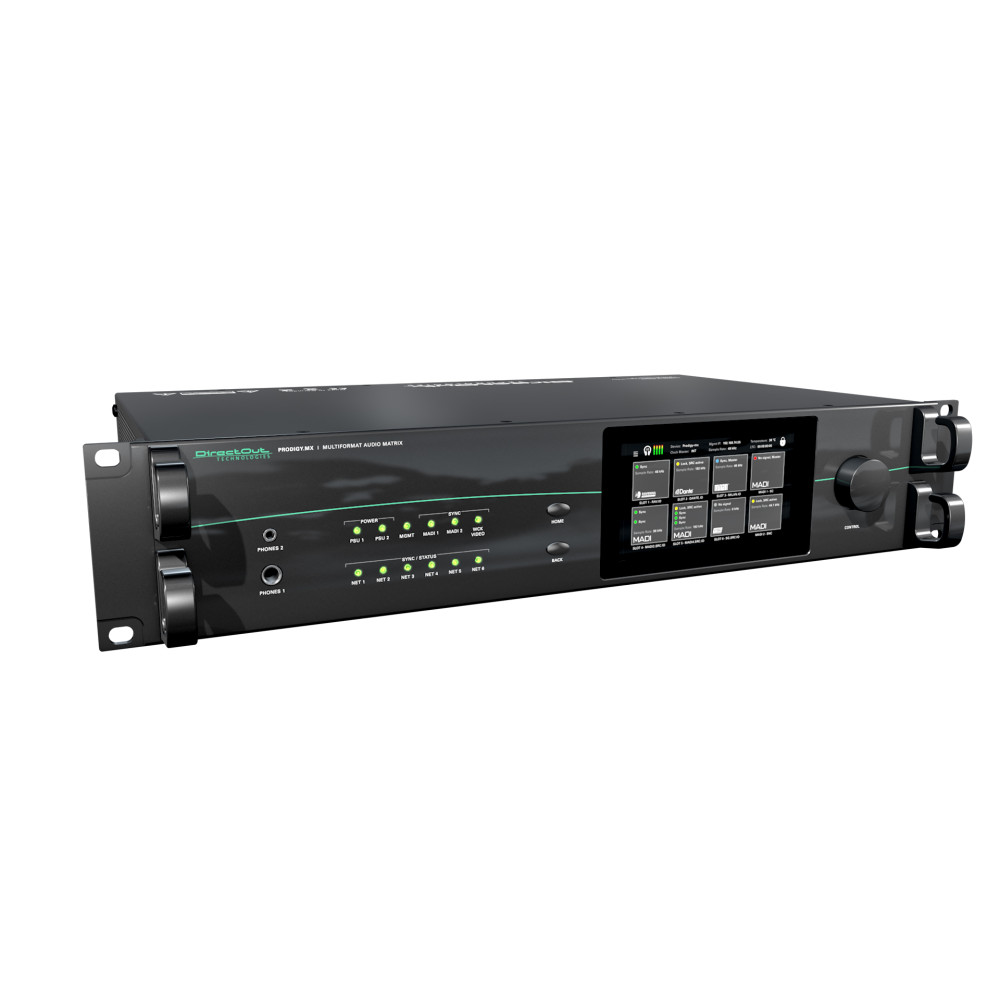 Frame de PRODIGY.MX. Conversión de formato y routing para sistemas síncronos y asíncronos de audio con capacidad de enlace de audio digital por red. Espacio para 2 tarjetas MADI y 6 tarjetas Network Audio (Dante, RAVENNA/AES67, SoundGrid y AVB/MILAN). Control a través de Software globcon, GUI con web-browser y un display frontal de 5". Fuente de alimentación redundante.