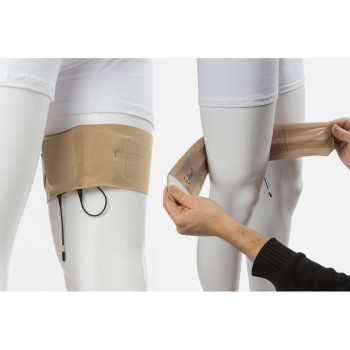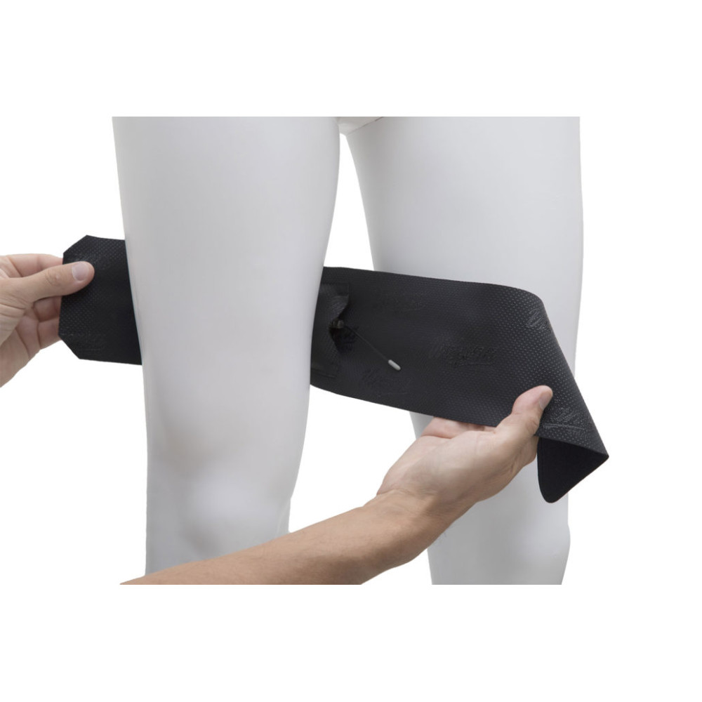 Correa muslo con bolsillo para petaca inalámbrica en posición horizontal, ideal para minifaldas y minivestidos. Talla única(58cm) Color negro. Producto Serie Extreme, que incluye un recubrimiento antideslizante en toda la superficie de la correa, antialergénico, transpirable, suave y confortable. Ideal para teatro y musicales.