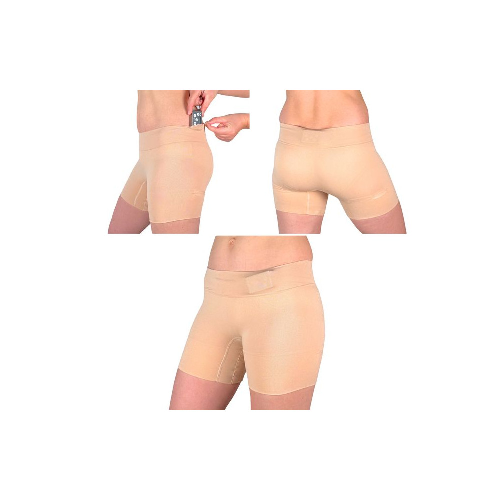 Boxers porta-petaca. Talla L 44-48. Beige. Material muy fino, ligero y que no oprime el cuerpo. Varios compartimentos porta-petaca: Alrededor de toda la cintura o en el interior de los muslos. Diseñado para simplificar la colocación de petacas y micrófonos debajo de atuendos de teatro. Compatible con transmisores pequeños: Wisycom MTP61, Sennheiser SK6112/5212, Lectro SSM, SMV, SMQV, PDR, Shure ADX1M...