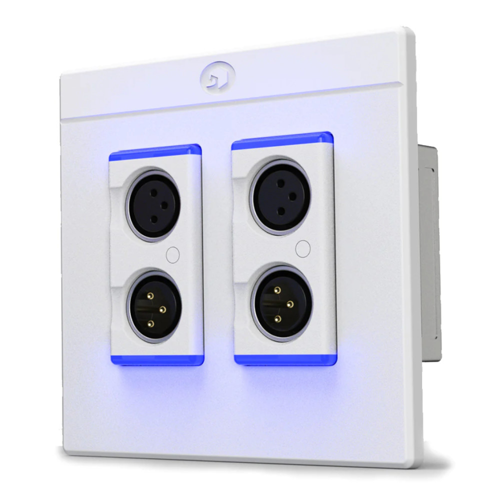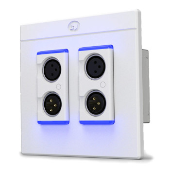 Cajetín DANTE con 2x Entradas Micro XLR, 2x salidas línea analógica. Alimentación por PoE. Formato Americano con caja doble. Color blanco.