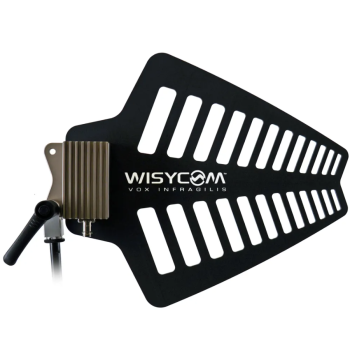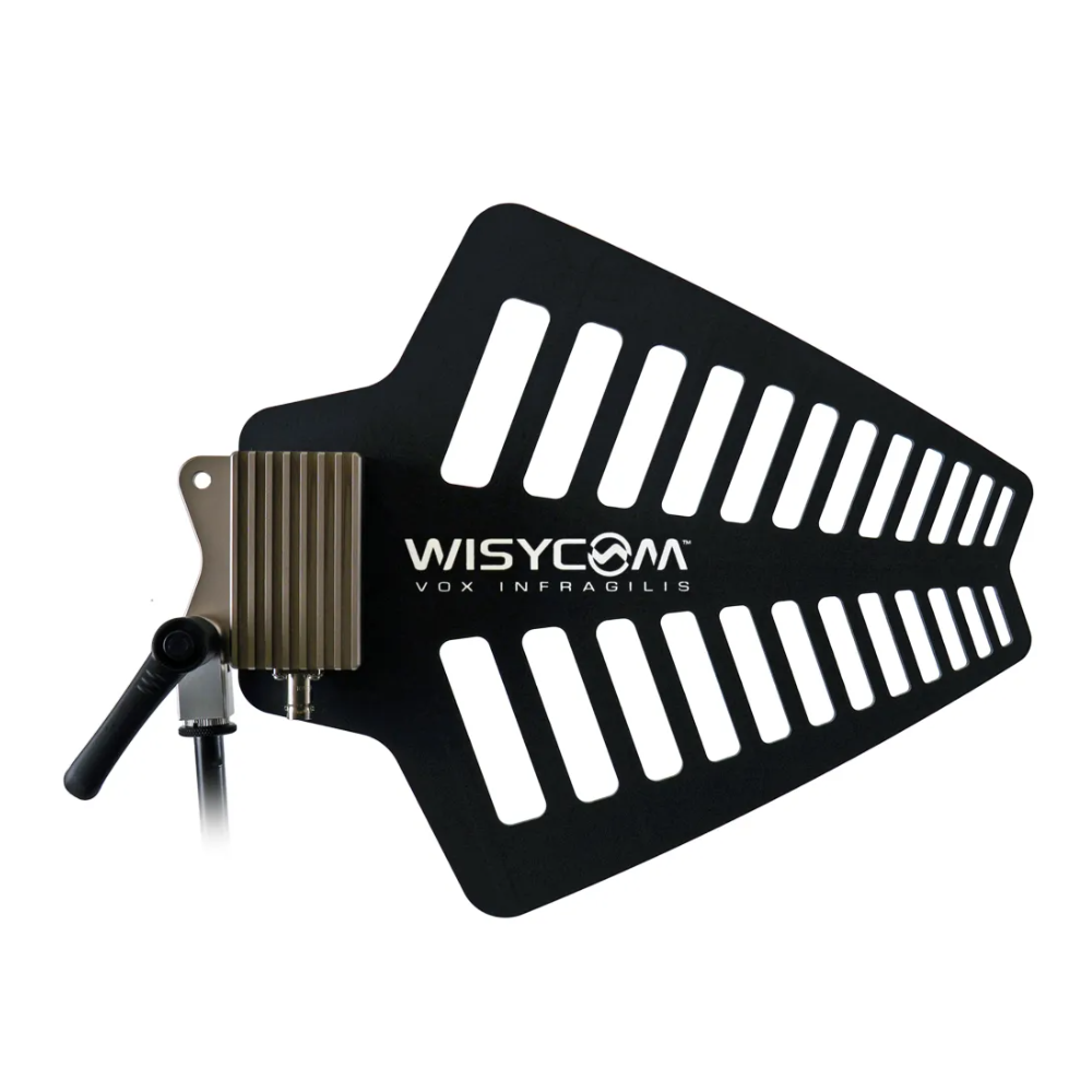 Antena directiva con booster. Banda 566-800Mhz. Perforaciones verticales para evitar efecto bandera. Conector BNC