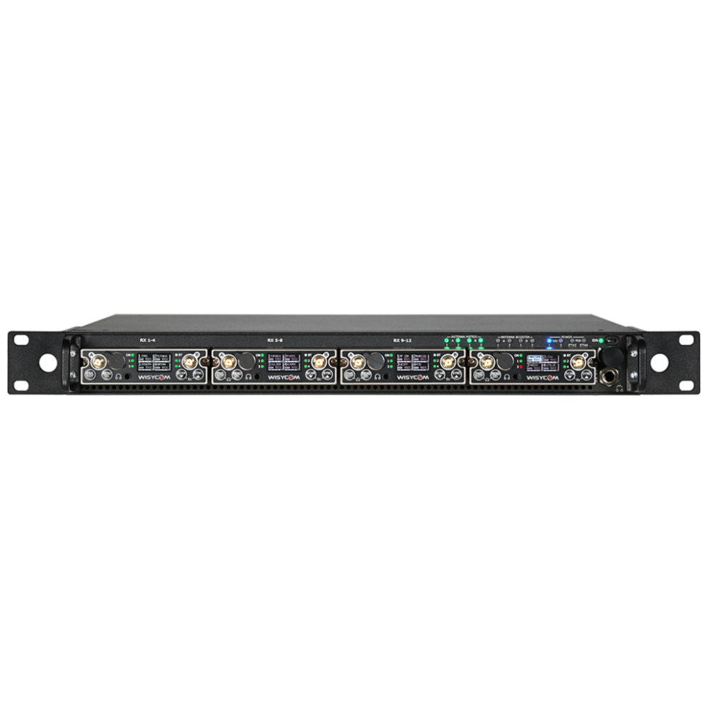 Chasis 19" una unidad de rack con cuatro eslots para alojar cuatro receptores MCR54 470-1260 Mhz. El MRK16 dispone internamente de una distribución de RF capaz de suministrar alimentación a cuatro antenas tipo, LFA, BFA, ADFA. Cuadruple conexion RJ, dos para control y dos con interface Dante "redundante". Slot para instalacion de tarjeta receptora de RF mediante fibra optica, esta tarjeta se vende por separado. Dos conectores Sub D25 para salidas de señal analógicas balanceadas. Entradas de señal de antena para la dos zonas con conectores BNC. Salida de señal de antena con conectores SMA para gestionar estas señales en otros dispositivos. Dos conectores tipo RJ, y un conector Sub D25 para las salidas de audio digitales AES72-AES3-AES59. USB-C para carga de dispositivos (opcional). Conexion de fibra optica para enviar señales de audio con protocolo Dante y control a otros dispositivos (opcional). Conexion de antena Bluetooth para gestion de parametros mediante aplicacion gratuita Wisycom BT, compatible con IOS y Andrid. Conector base XLR4-M para alimentacion, este conector base nos permite con el cable CDC06 (opcional) suministrar alimentacion redundante para asegurar el funcionamiento del dispositivo en caso de fallo de la alimentacion principal. Salida de auriculares en panel frontal para monitorizacion. Encoder para acceder a los parametros de configuracion y manejo en panel frontal. Indicadores en panel frontal de activacion antenas, matriz, y boosters. Alimentacion POE (opcional). Tambien dispone de indicadores para alimentacion POE y alimentacion convencional. Orificios en los extremos del panel frontal para poder instalar conectores de antena. Entrada de alimentación entre 10-28 Vdc con conector XLR4 M. Incluye fuente de alimentacion. NO INCLUYE CABLE DE ALIMENTACIÓN Schuko a IEC.