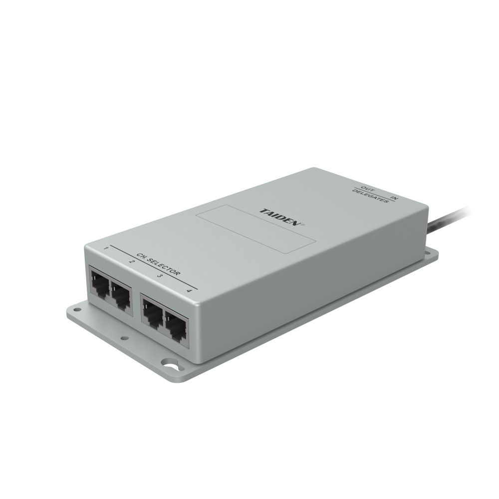 Cajetín con una entrada 8-pin (cable 2m) y 4 salidas RJ45 para conectar a 4 unidades HCS-4842DHT de selección de canal de TRADUCCIÓN.