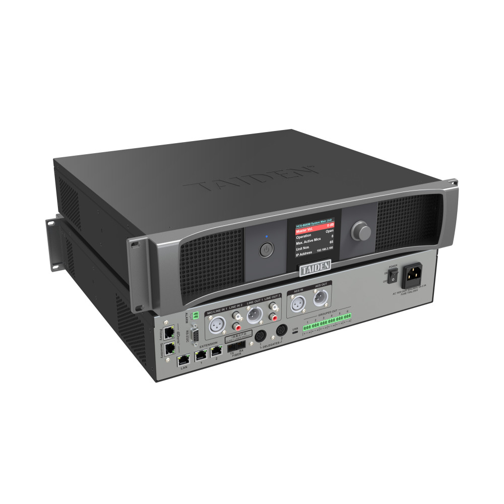 Unidad Central Digital para serie 8600 (VOZ, VOTACIÓN, TRADUCCIÓN 64ch). Conexión fibra óptica Mono-Modo, Entradas y Salidas AES/EBU, Interface DANTE, salida Mic Group. 2U rack.