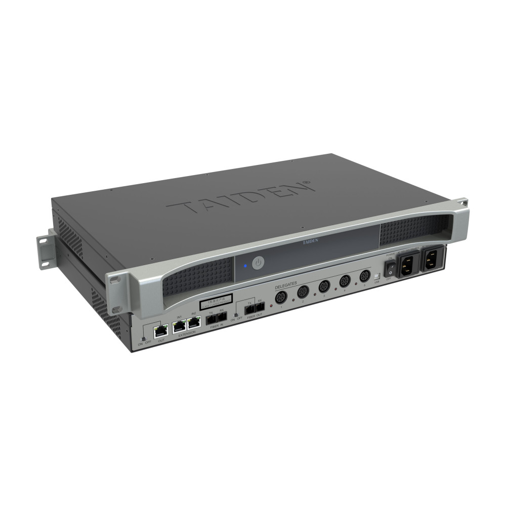 Extensión para Unidad principal para sistema de Conferencia Digital. 2 Interfaces Ópticos Monomodo y 5 salidas de 8pines para unidades congress. Fuente de alimentación redundante. 1U rack.