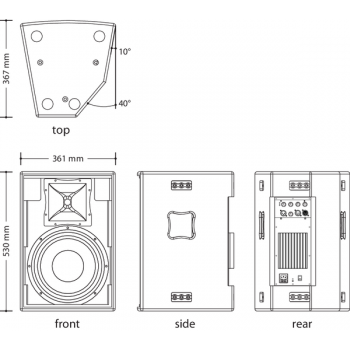 Recinto acústico auto-amplificado, 2 vías. con módulo de amplificación 350W + 70W. Respuesta en frecuencia: 60-18.000Hz (±3dB). LF 1 woofer de 12" con bobina de 3"; HF motor de compresión 1" con bobina de 1,7". Max SPL 128dB. Cobertura 90º x 70º, Frecuencia Crossover 1.700 Hz. Conexiones de entrada XLR-3. Peso 25 kg. Dimensiones (WxHxD) 361 × 530 × 367 mm. Acabado en color negro.