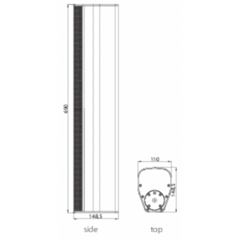 Recinto acústico tipo columna para interior,, 200 W RMS, 16 Ohms; 115º x 20º , 135 - 17.000 Hz, 8 woofers de 3" y motor de 0,75", 95 dB @1W/1m, 114/120 dBs. Conectores de entrada 4 polos in/out. Peso 7,5 kg. Dimensiones 110 x 690 x 148,5 mm. Acabado en color blanco.