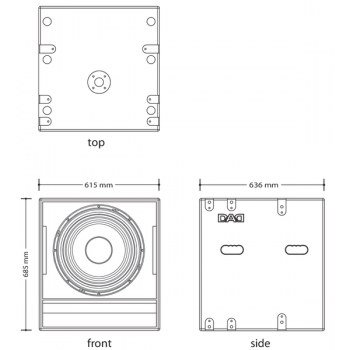 Subwoofer pasivo, 1700 W RMS, altavoz de 18" con bobina de 4,5" Neodimio,( ohms, Frecuencia 35–150Hz (±3dB),Configuración Bass Reflex, 134 dB SPL , Conectores Neutrik NL4; Adaptador para soporte a stand de 35mm. Peso 51 Kg. Dimensiones 615 x 685 x 636 mm.