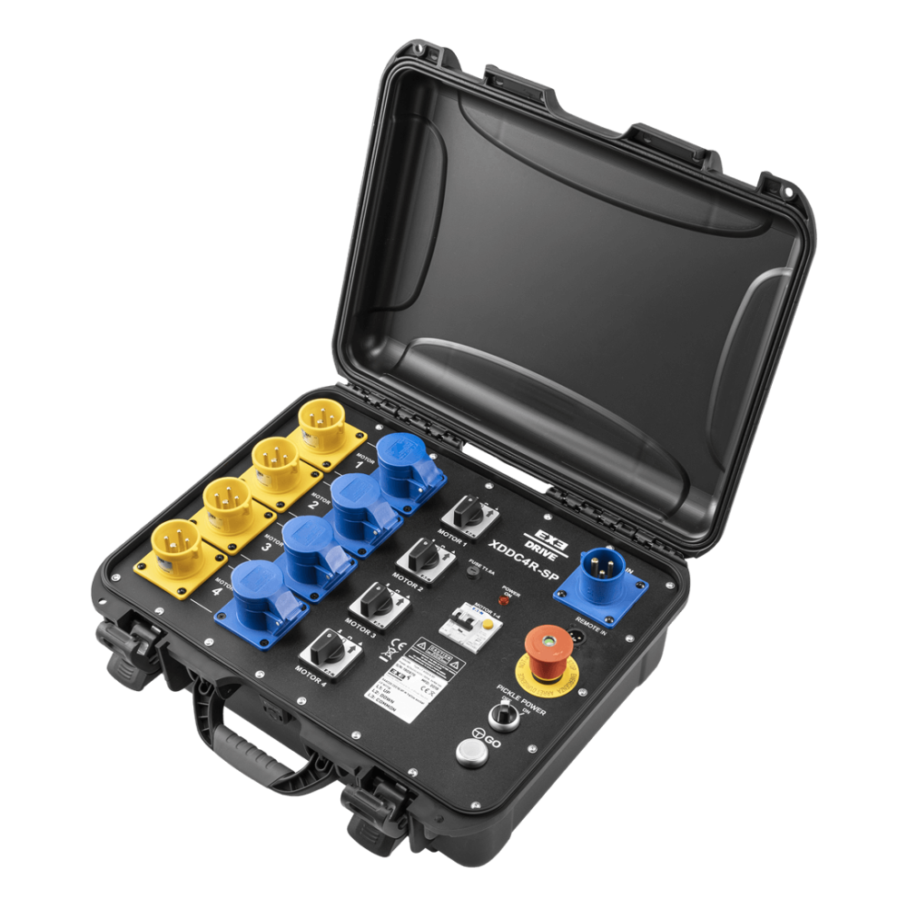 Manejo a través de 4 selectores de 3 posiciones subir - 0 - bajar y botón de Go con información de estado con pilotos luminosos. Compatible con mando XDRHGC