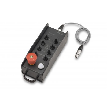 Dispone de ocho conmutadores de selector (UP-OFF-DOWN) con indicadores bicolores, pulsador de Go y seta de emergencia