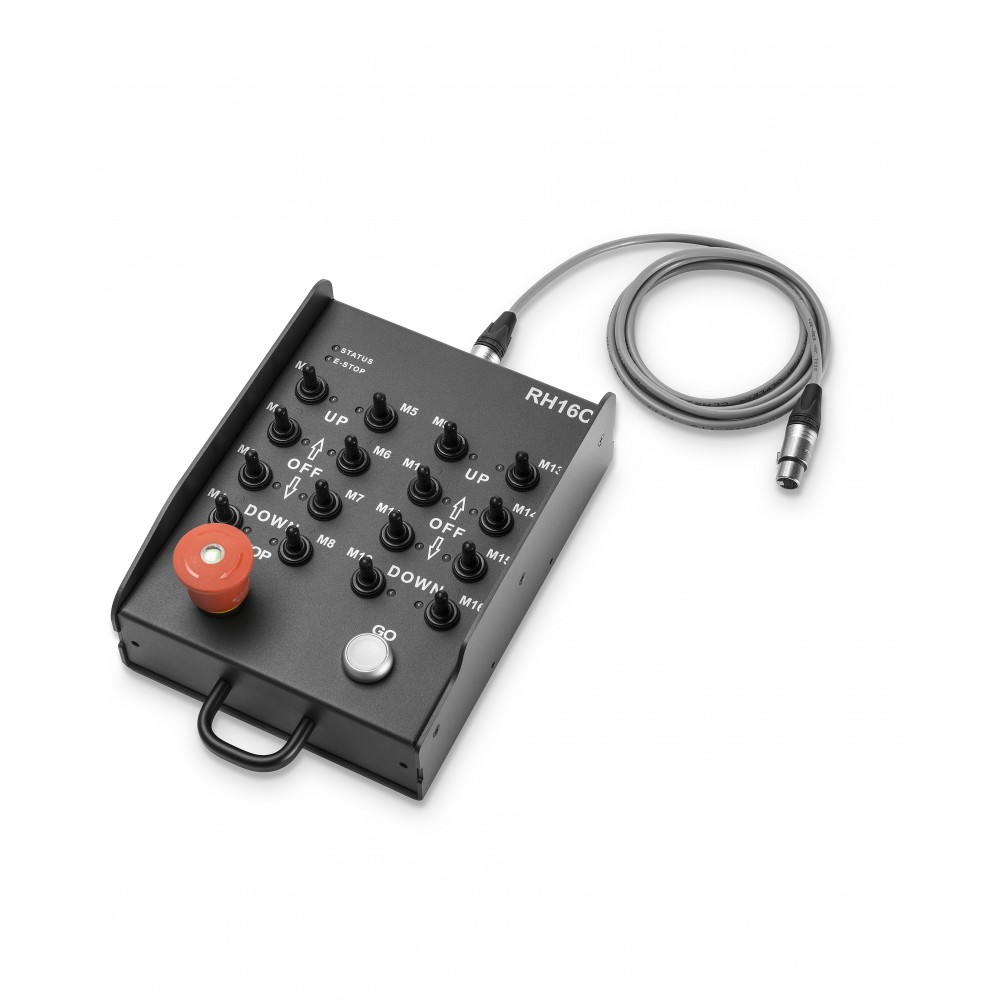 Dispone de dieciséis conmutadores de selector (UP-OFF-DOWN) con indicadores bicolores, pulsador de Go y seta de emergencia