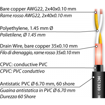 Cable balanceado para micrófono, 90% de blindaje, cobre O.F.C., 6,7mm de diametro exterior. AWG22, 2x40x0,10 mm. Negro.