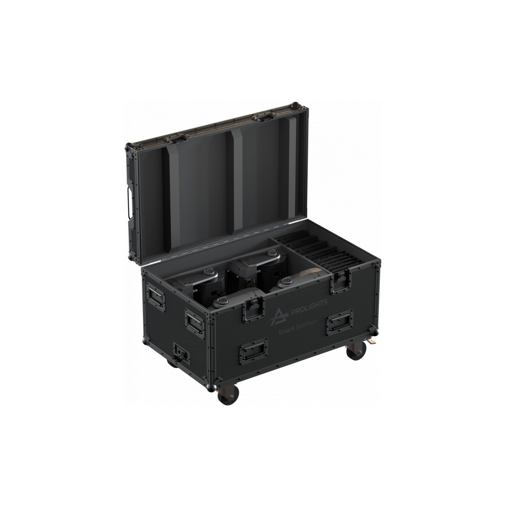Flight-Case con 4x SMARTWASH. 4x cables True1 para garga. 1x Cable puntas peladas a PowerCON TRUE1 para conexión de FC. 4x Viseras. 4x Omegas OS25. (LxHxW): 1000x701(571 con ruote)x600 mm. Peso 97Kg.