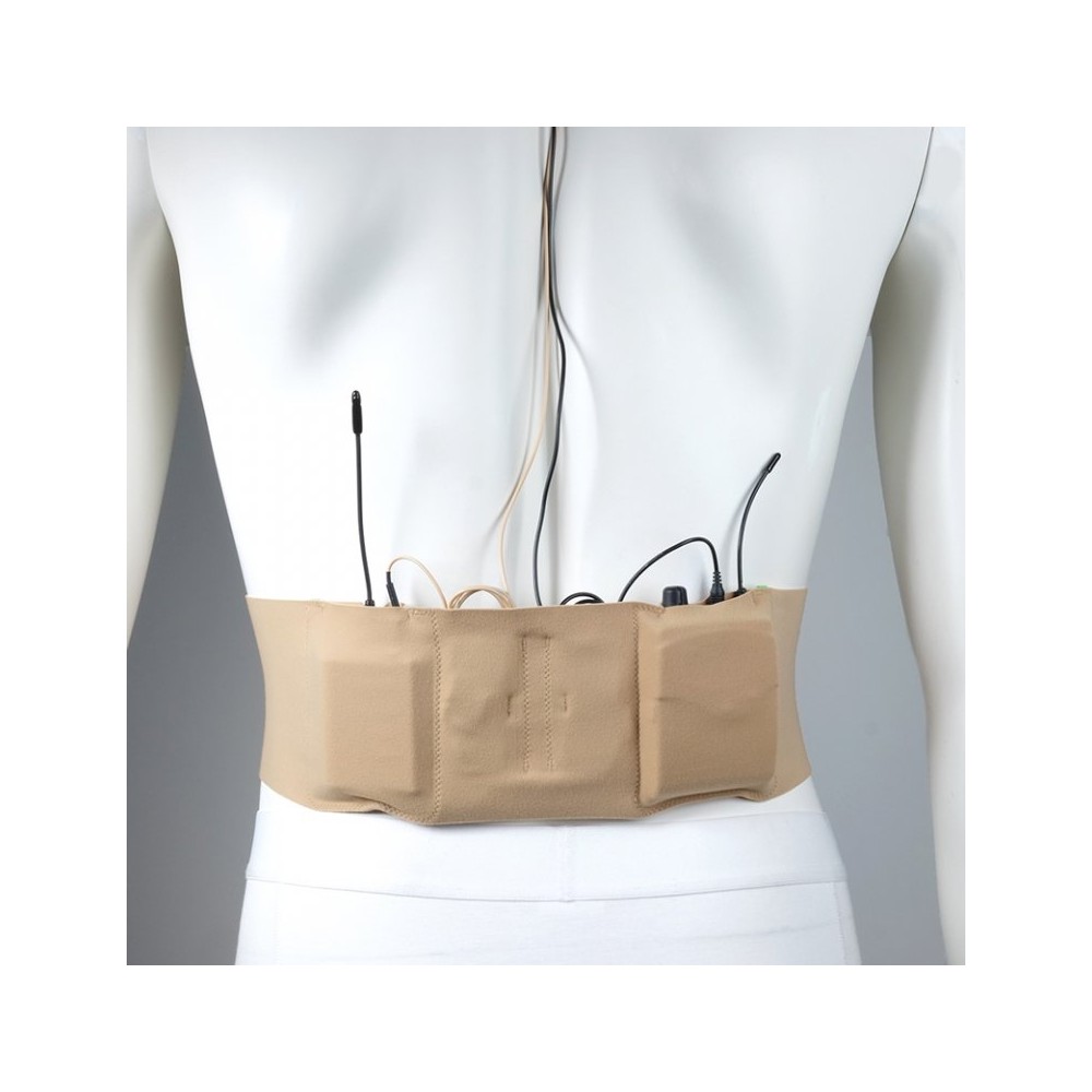 Correa para cintura de 2 compartimentos grandes. Talla L: 120cm. Color beige. Contiene un compartimento para poder doblar el cable, sin la necesidad de usar ningún sticky. Compartimentos grandes de 10x8cm(para petacas cómo Wisycom MTP60).