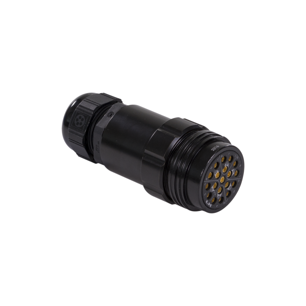 Conector SPIDER con carcasa de Aluminio Hembra aereo. 19 contactos bañados en oro. 25A. Roscado para ensamblaje. Estopa PG29, IP64 Peso 0'25kg.