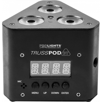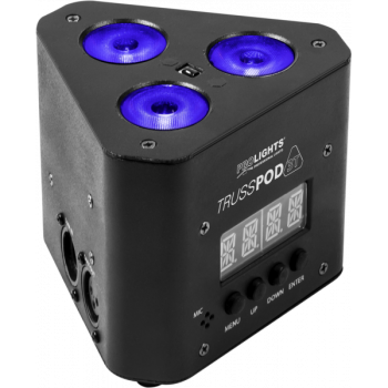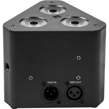 Proyector PAR Triangular MultiLed con 3x3'5W RGB, con flujo de 321 Lúmenes. 106'2 lux 16° @5m. Vida Led >50.000 h >70%. Diseñado con forma triangular y los conectores laterales para poder meterlo dentro de los trusses de tamaño >250 mm en aplicaciones donde queramos tintar los trusses de color. Mezcla de color aditiva RGB con Presets de CTO de 3.200°K~10.000°K, Rueda de color Virtual con Presets predefinidos. Ópticas de 16° (32° en ¹/10 de Peak Angle). Dimmer y Shutter con macros pregrabadas con velocidad ajustable. Protocolo DMX512 por conectores XLR3 pins In/Out. Receptor IR compatible con Mando IR de Prolights incluido. Control 3 o 8 canales. Sistema de refrigeración Pasiva sin ventiladores, que lo hacen totalmente silencioso. Alimentación 100~240 VAC 50/60 Hz por conector IEC, Consumo 11'4W. IP30. Dimensiones (WxHxD): 121x104x108 mm, Peso: 0'65 kg.