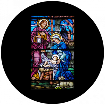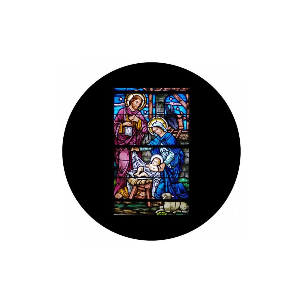 Gobo en cristal de Borosilicato. Vidriera Sagrada familia Nacimiento. Diámetro exterior de Ø26'8 mm, imagen Ø23 mm