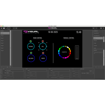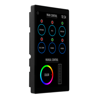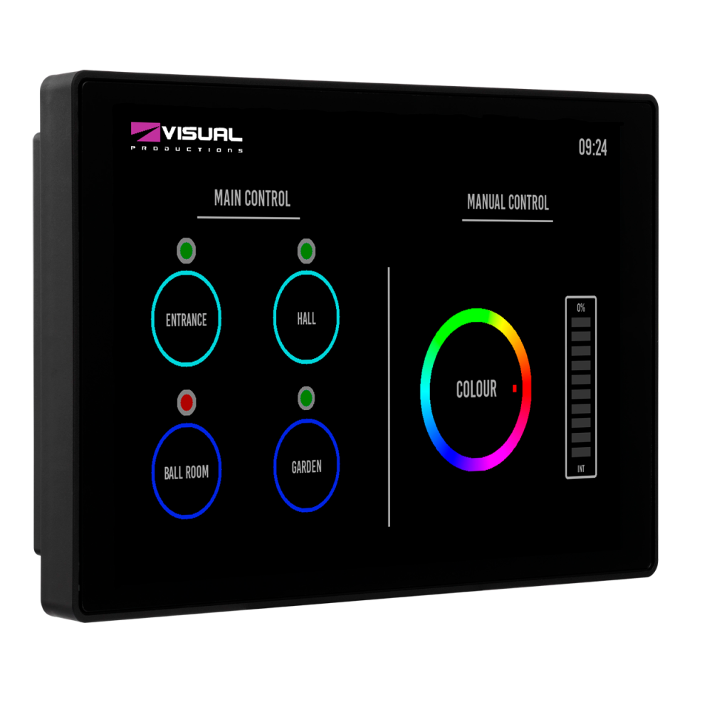 Pantalla táctil de 7" con resolución de 1200x800px e interfaz personalizable mediante Kiosc Editor o Showcontrol de CueCore.