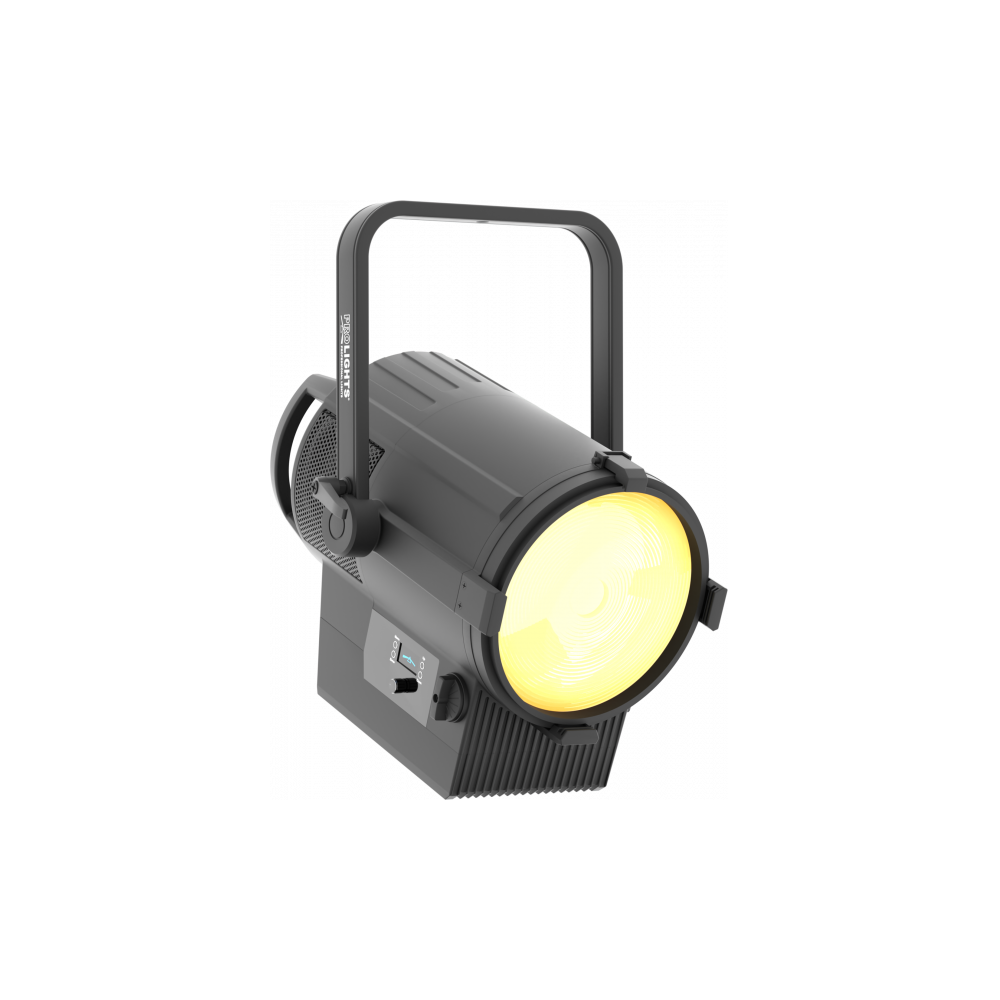 Proyector Fresnel con fuente Led con 507W Blanca Cálida para conseguir la luz de un Fresnel de incandescencia de 2KW y altísima precisión cromática. CRI >95 R9 >94, TM30-15RF: 88 / 107 - TLCI: 90'8. Temperatura de color de 3.200°K. Diseñado para cubrir las necesidades de un Fresnel convencional de 2KW con lente de Ø250mm, con las ventajas de la fuente Led y su capacidad de proyectar luz blanca de la mayor calidad. Zoom manual de 15° a 45° operado por Mando giratorio en el lateral. Dimmer y Shutter con macros pregrabadas con velocidad ajustable y con frecuencias PWM seleccionables desde 600Hz a 25kHz. Todas estas características lo hacen ideal para Broadcast, Eventos corporativos y Teatro. Visera de 4 palas con 4 aletas (Mariposa) y Bulón de 28 mm con sistema BiPin anti giro incluidos. Lira con Apriete Manual. Protocolo DMX512 y RDM por conectores XLR5 pins In/Out. Control por Knob o 1 / 2 - 1 / 2 - 2 / 3 o 5 canales. Sistema de refrigeración líquida y convección combinadas que lo convierte en muy silencioso. Alimentación 100~240 VAC 50/60 Hz por PowerCON True1 In/Out, Consumo máx. 466W. IP20. Color del recubrimiento exterior Negro. Dimensiones (WxHxD): 421x537x456 mm. Peso 17'2 Kg.