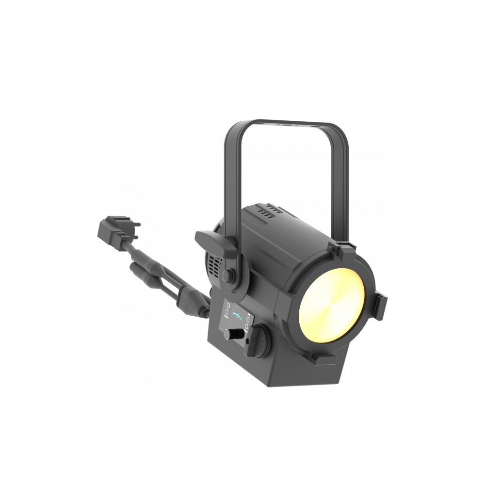 Proyector Fresnel con fuente Led con 38W Blanca Fría para conseguir la luz de un Fresnel de descarga de 100W y gran precisión cromática. CRI >82, T. Flujo de 2.851 lúmenes. Temperatura de color de 3050°K. Diseñado para cubrir las necesidades de un Fresnel con lámpara de descarga de 100W con lente de Ø100mm, con las ventajas de la fuente Led como, regulación de intensidad, durabilidad, estabilidad y su capacidad de proyectar luz blanca de la mayor calidad durante toda la vida del proyector. Zoom manual de 15° a 55° operado por Mando giratorio en el lateral. Dimmer y Shutter con macros pregrabadas con velocidad ajustable con frecuencias PWM seleccionables desde 600Hz a 25kHz. Todas estas características lo hacen ideal para pequeños Sets de Broadcast, Eventos corporativos y Teatro. Visera de 4 palas con 4 aletas (Mariposa) incluida. Protocolo DMX512 y RDM por conectores XLR5 pins In/Out. Control por Knob o 1 / 2-1 / 2-2 / 3 o 5 canales. Sistema de refrigeración pasiva sin ventiladores, siendo totalmente silencioso. Alimentación 100~240 VAC 50/60 Hz por Schuko y cable directo, Consumo máx. 25'1W. IP20. Color del recubrimiento exterior Negro. Dimensiones (WxHxD): 191x281x203 mm. Peso 2'38 Kg.