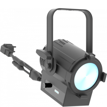 Proyector Fresnel con fuente Led con 38W Blanca Cálida para conseguir la luz de un Fresnel de incandescencia de 150W y altísima precisión cromática. CRI >93, T. Flujo de 2.183 lúmenes. Temperatura de color de 3050°K. Diseñado para cubrir las necesidades de un Fresnel convencional de 150W con lente de Ø100mm, con las ventajas de la fuente Led y su capacidad de proyectar luz blanca de la mayor calidad. Zoom manual de 15° a 55° operado por Mando giratorio en el lateral. Dimmer y Shutter con macros pregrabadas con velocidad ajustable con frecuencias PWM seleccionables desde 600Hz a 25kHz. Todas estas características lo hacen ideal para pequeños Sets de Broadcast, Eventos corporativos y Teatro. Visera de 4 palas con 4 aletas (Mariposa) incluida. Protocolo DMX512 y RDM por conectores XLR5 pins In/Out. Control por Knob o 1 / 2-1 / 2-2 / 3 o 5 canales. Sistema de refrigeración pasiva sin ventiladores, siendo totalmente silencioso. Alimentación 100~240 VAC 50/60 Hz por Schuko y cable directo, Consumo máx. 25'1W. IP20. Color del recubrimiento exterior Negro. Dimensiones (WxHxD): 191x281x203 mm. Peso 2'38 Kg.