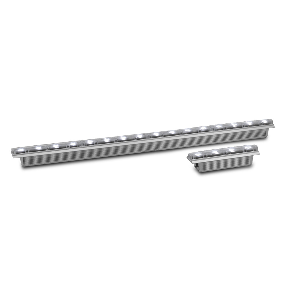 Barra tipo StripLight intemperie de 15° QUAD (RGBW) LEDS OSRAM OSTAR para luz arquitectónica de Aluminio IP66 IK08 con un total de 80W, Color Aluminio Anodizado. El Exterior Linear 1210 Graze NARROW es un aparato con cambio de color Led, muy robusto, diseñado para aplicaciones en exterior. Toda la gama de aparatos Exterior Linear están diseñados para iluminar, dar textura a paredes o estructuras lineales, con un cambio de color, uniformidad y de distribucion de la luz magníficos. Flujo de 2820lm, Ángulo de 15° (22° half Peak Angle). Control DMX 512 estándar de 4 sectores independientes con 3/4 canales por cada uno (Max16), compatible con RDM ANSI/ESTA E1.20. Conectores híbridos de entrada/Salida de corriente y señal de 8 Pins IP68 que permiten la conexión directa de un aparato a otro cuando están juntos. Guía en el propio chasis para poner los soportes "Mounting Brackets" y los "Mounting flanges" que permiten la orientación del aparato. El direccionamiento tiene que hacerse mediante RDM que permite incluso la monitorización del estado. Detección automática de suministro de tensión y frecuencia 100~277V 50/60Hz con conexión Híbrida, Accesorio de entrada Schuko y XLR5 de señal NO INCLUIDO (91611754). Dimensiones 1219x72x101mm. Peso: 6kg. IP66, IK08, Un Exterior Linear 1210 QUAD Graze, NARROW de color Aluminio con 2 Mounting Brackets y 2 Mounting Flanges incluidas en caja de cartón. MAR-90356993