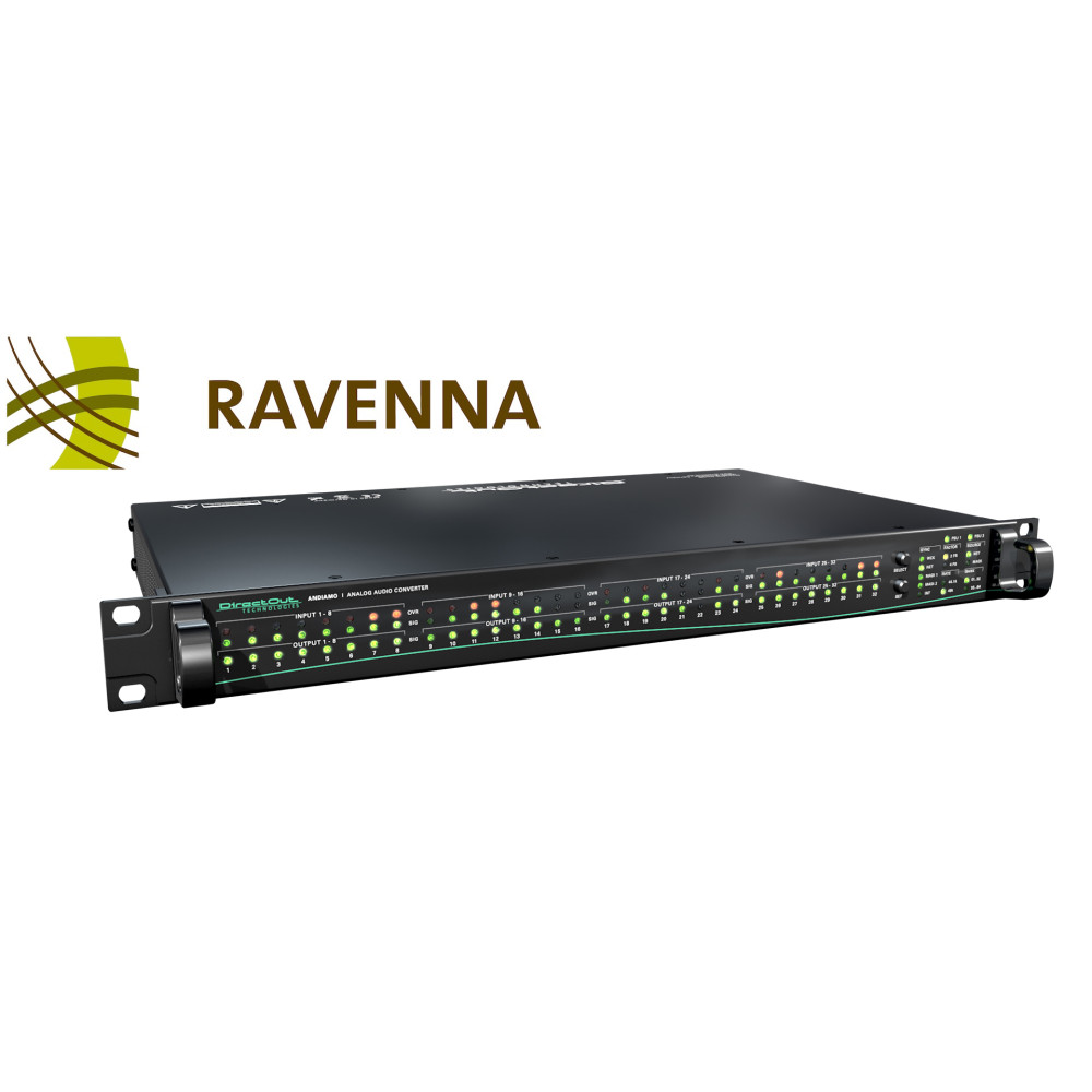 Conversor de 32 Canales Analógicos a MADI y viceversa. Incluye tarjeta interna de Audio por Red RAVENNA/AES67. Puerto Ethernet control. 1U rack.