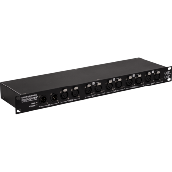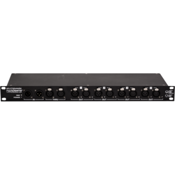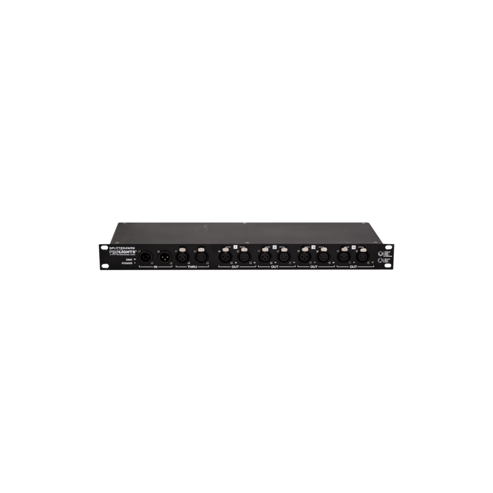 SPLITTER4WRK es un Splitter de 1x entrada y 4 salidas de 1 unidad de 19". Distribuidor de señal DMX512 con 1x entrada por conectores XLR3&5 pins y 2x Conectores XLR de 3&5Pins para DMX trhu, que posibilita el puenteo con otros Spliters. 4 salidas Opto-aisladas con Conectores de 3&5 pins cada una. Alimentación 230VAC 50Hz 500mA. por conector IEC de 10A. Dimensiones (WxHxD): 483x44x138mm. Peso 3Kg.