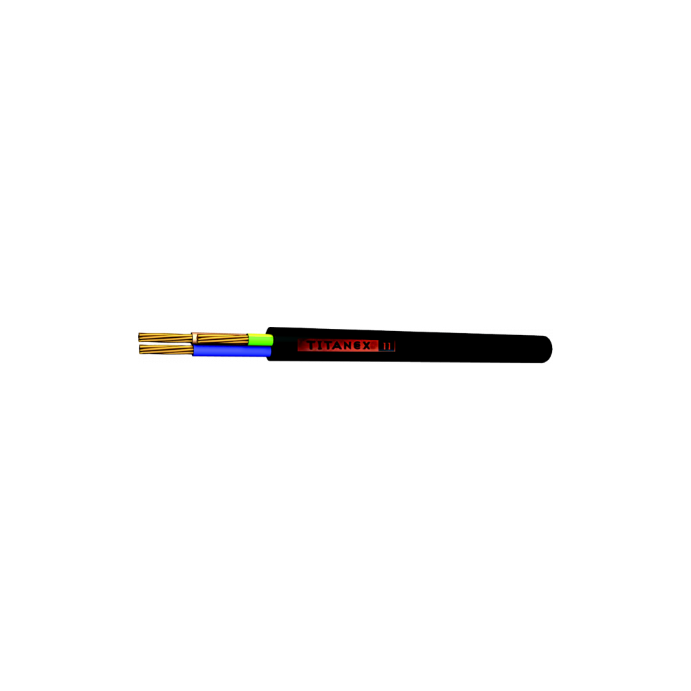 Cable de corriente TITANEX superflexible de 5x6mm, 450/750V. Retardante de Fuego según la norma IEC/EN 60332-1-2 (NO C2). Puede instalarse al aire libre o enterrado mediante accesorios mecanicos de proteción extras. 5'84 V/A. Km. Peso 557 gr/m.