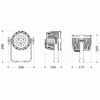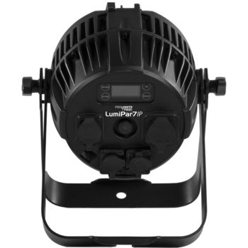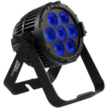 Proyector PAR IP65 MultiLed con 7x9W RGBW, con flujo de 3.835 Lúmenes. 235lux 45° @5m. Vida Led >50.000 h >70%. Diseñado para ser usado tanto en teatro, conciertos e iluminación arquitectural. Mezcla de color aditiva RGBW con Presets de CTO de 3.000°K~10.000°K, Rueda de color Virtual con Presets predefinidos. Ópticas intercambiables de 45° (60° en ¹/10 de Peak Angle) incluidas y posibilidad de usar ópticas de 20° (36 en ¹/10 de Peak Angle) para mayor apertura NO incluidas. Dimmer y Shutter con macros pregrabadas con velocidad ajustable. Protocolo DMX512 por conectores Seetronic XLR5 pins waterproof In/Out. Control 4 / 6 o 11 canales. Sistema de refrigeración Pasiva sin ventiladores, que lo hacen totalmente silencioso. Alimentación 100~240 VAC 50/60 Hz por conector Seetronic PowerCON waterproof In/Out, Consumo 65W. IP65 de protección Waterproof. Dimensiones (WxHxD): 240x286x154 mm, Peso: 3'64 kg.