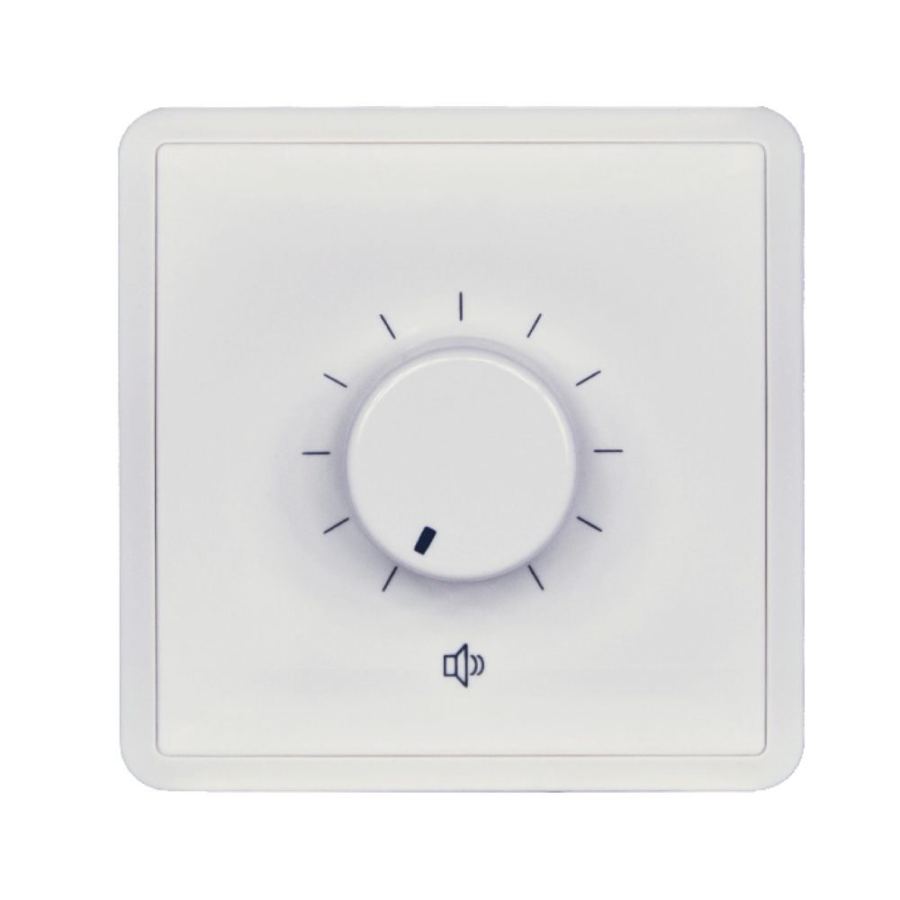 Control de volumen pared, línea de 100V de 20W. Relé 24V DC. 80x80x60mm (AlxAnxPr). Requiere cajetín empotrar 70x70mm, o caja superf. (WB3102). Color blanco.