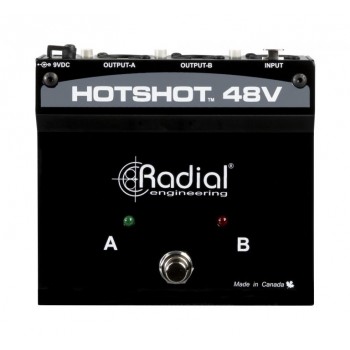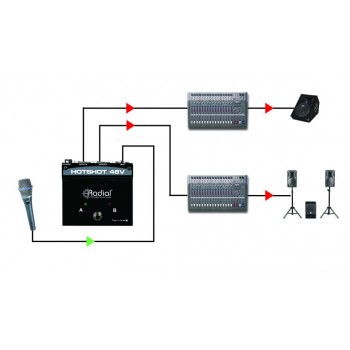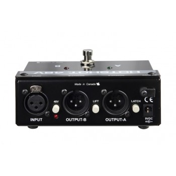 Switch para micrófono de condensador, con alimentación Phantom 48V incorporada, para redirigir el audio hacia monitores. El interruptor de pie se puede configurar como un interruptor de enclavamiento o momentáneo. La conmutación es silenciosa sin chasquidos o clics a través del sistema de PA.