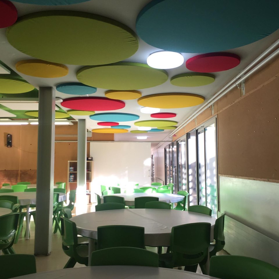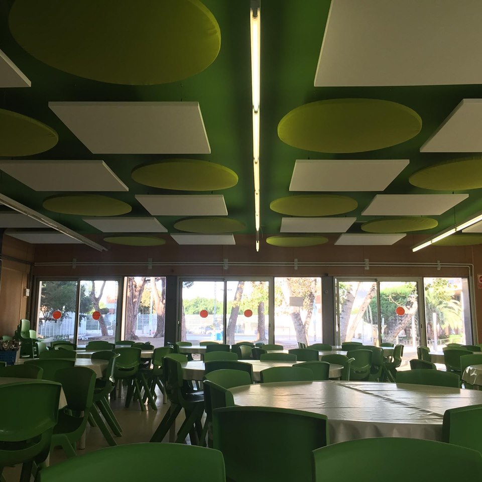 Acondicionamiento acústico en el comedor de la escuela Edumar de #castelldefels con paneles acústicos Isinac para mejorar el confort de alumnos y profesores.