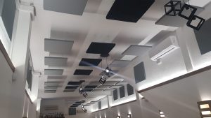Querían solucionar el problema del ruido, sin renunciar al diseño, para ello se instalaron paneles cuadrados en tonos grises y negros que le dieron al local un aire moderno.