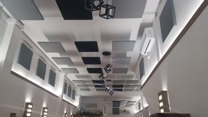 - 53 paneles ISINAC cuadrados 61×61 cm. Grosor 4 cm. Con revestimiento textil.