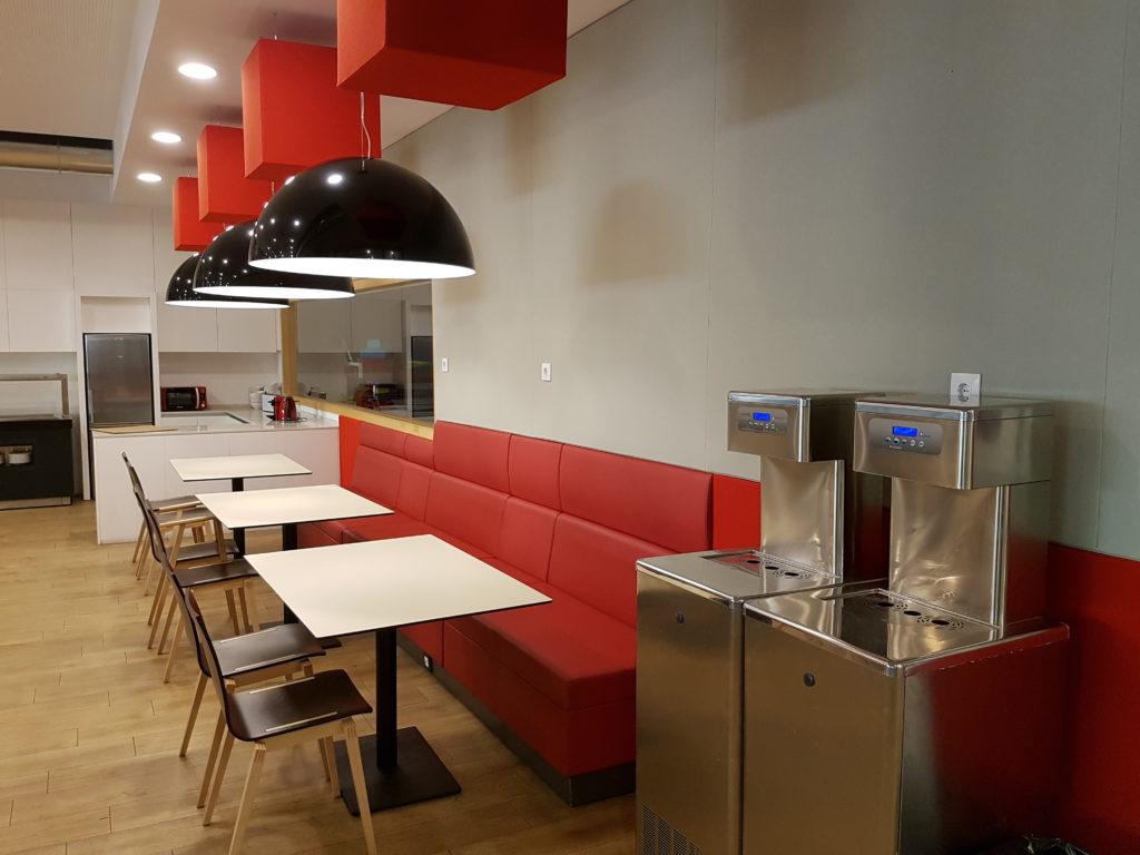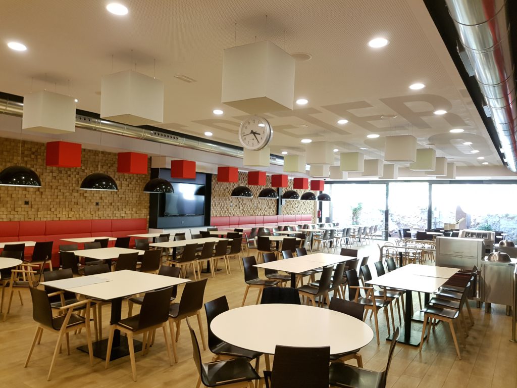 Más de 150 alumnos por cada turno llenan cada día este comedor que cuenta, además, con cocina abierta, lo que supone un alto grado de actividad y ruido en su interior. Gracias a los Abso Cube de Texaa junto con el revestimiento de pared Vibrasto3, se ha conseguido mejorar el confort, rebajando el tiempo de reverberación inicial de más de 2,70 segundos, a 1,1 segundos. Sin duda alguna, esto ha permitido a los empleados del comedor realizar sus tareas más cómodamente y a los alumnos y profesores, que comen a diario en este espacio, rebajar su nivel de estrés en su momento de relax y desconexión escolar.